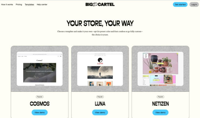 Big Cartel是一个简单的电商建站工具,专为销售手工艺品和艺术品等产品的独立艺术家和创作者设计。只有12个可自定义模板、最少的自定义选项和有限的精选应用库,Big Cartel保持网站设计过程简单。